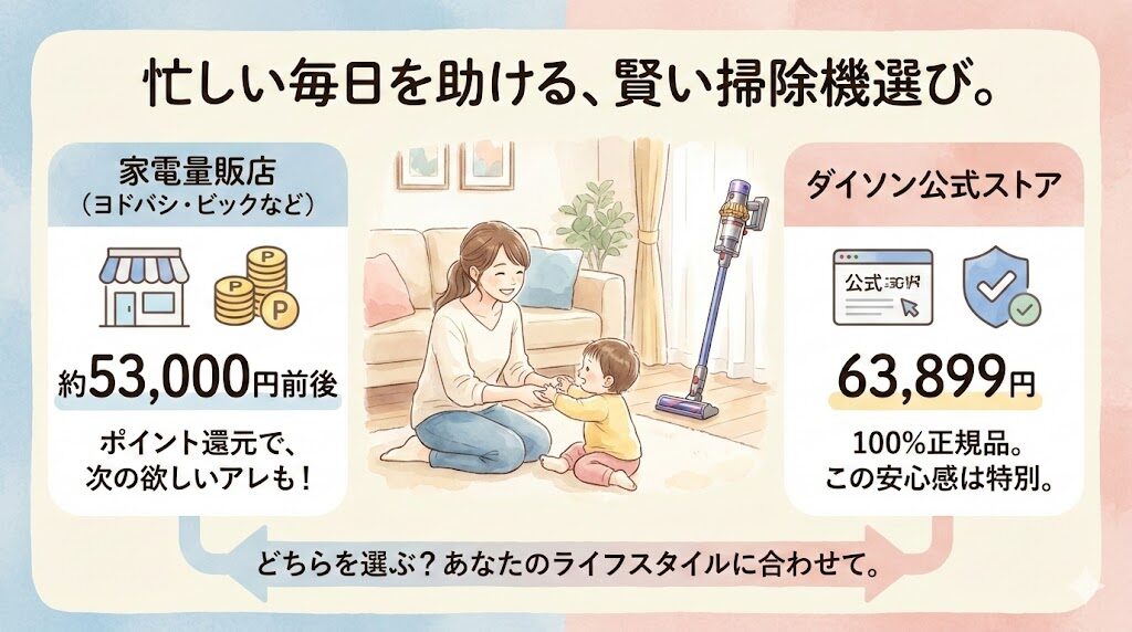 - トラブル防止のため、公式の保証が確実に受けられるダイソンの公式ショップでの比較をしています