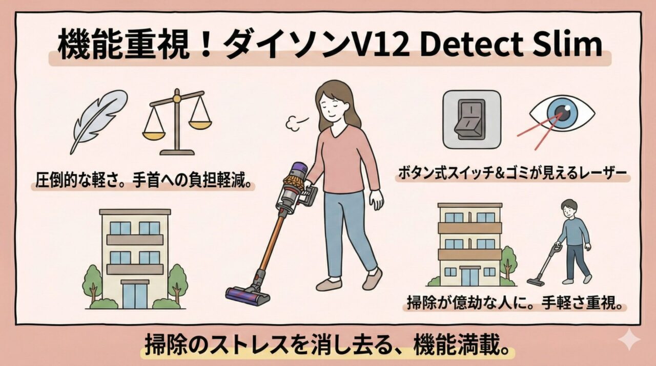 - 【V12】:マンション、毎日こまめ掃除派、軽さ重視、最新テクノロジー好き。