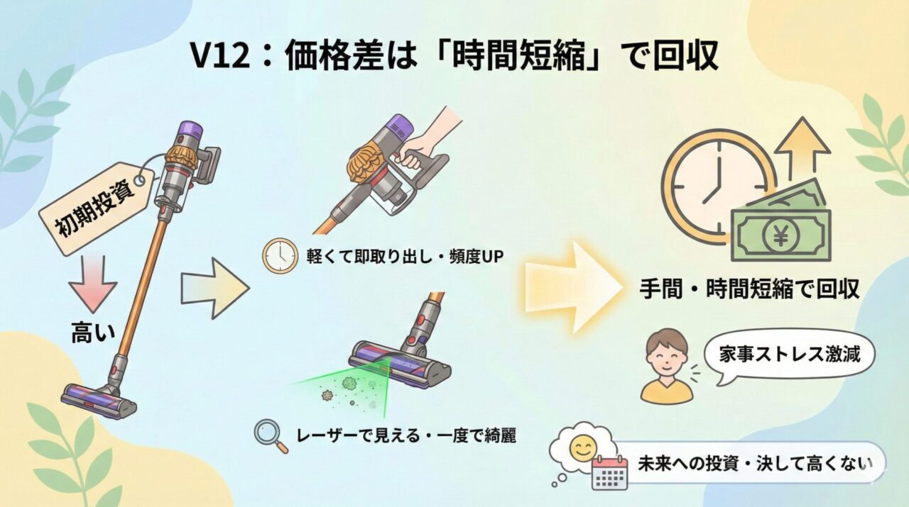 V12は高いですが、その値段の差は「掃除にかかる手間と時間の短縮」で十分回収できます。