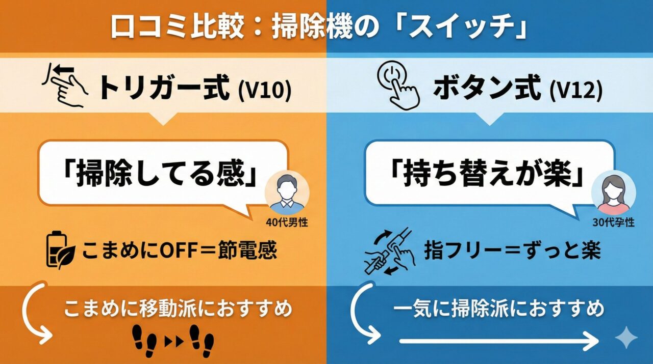 - 「V12のボタン式にしてから、掃除中に持ち替えができて本当に楽になった。」(30代女性)